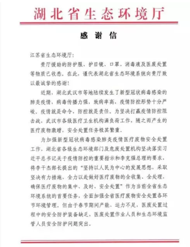 ? ?2月4日,江蘇省生態(tài)環(huán)境廳收到一封來自湖北省生態(tài)環(huán)境廳的感謝信,對其在“抗疫”關(guān)鍵時期雪中送炭捐贈緊缺物資表示衷心感謝。